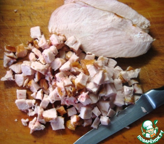 Нарезать куриную грудку кубиками (примерный размер - как бобы). Добавить к остальным ингредиентам.