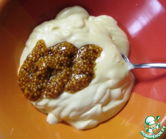 Для заправки салата смешать майонез и горчицу с зернами. Заправить салат и перемешать.