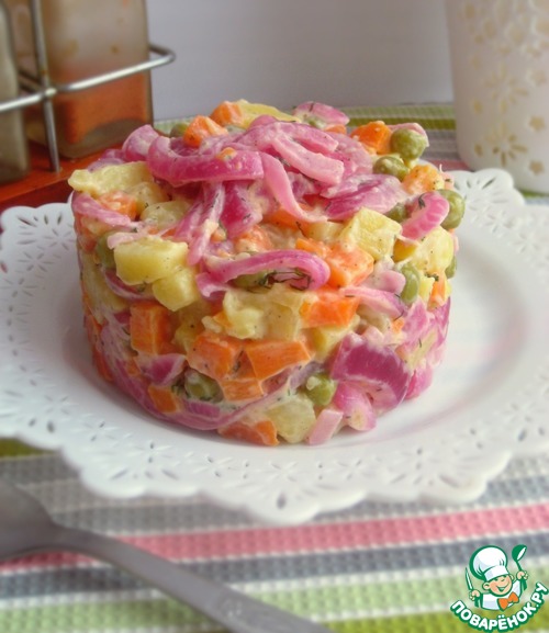 Идею этого салата присмотрела на польском кулинарном форуме. Салат из простого набора овощей и зеленого горошка. А яркий акцент в этом салате - красный лук, приготовленный в маринаде!