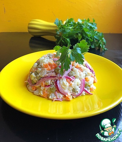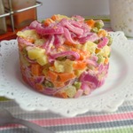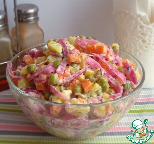 Идею этого салата присмотрела на польском кулинарном форуме. Салат из простого набора овощей и зеленого горошка. А яркий акцент в этом салате - красный лук, приготовленный в маринаде!