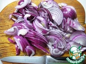 Красный лук нарезать полукольцами. |