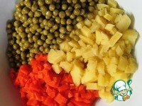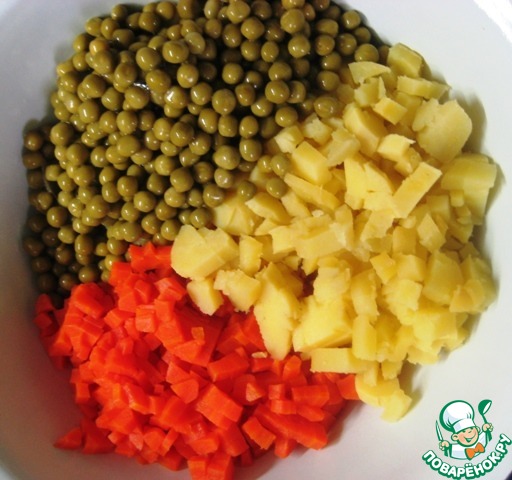Добавить к моркови и картофелю зеленый горошек (жидкость из банки предварительно слить). |