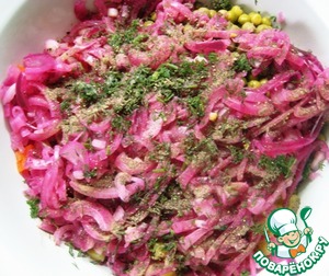 Добавить остывший маринованный красный лук, мелко нарезанный укроп, приправить черным перцем. |