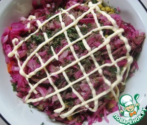 Добавить майонез, аккуратно перемешать и подавать к столу. |