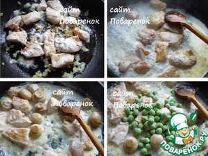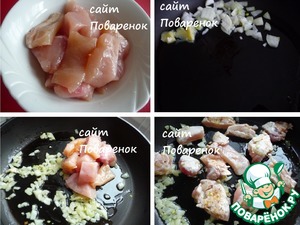 Добавить мясо, коротко обжарить. Мясо должно стать белым. -