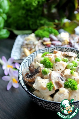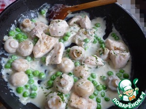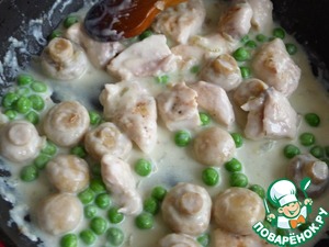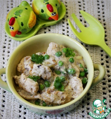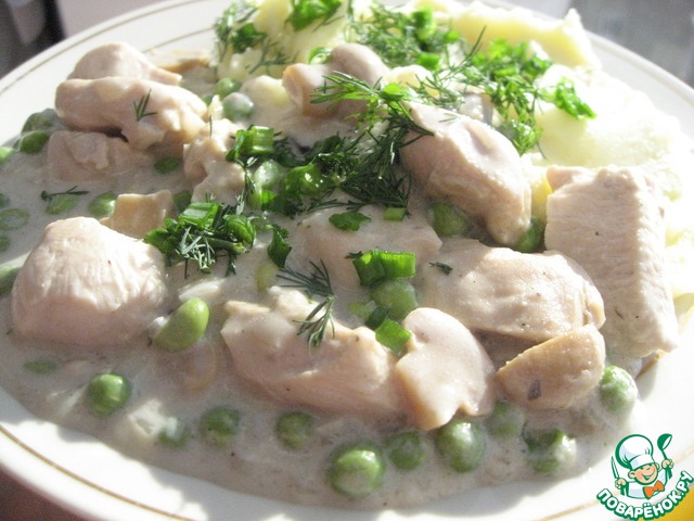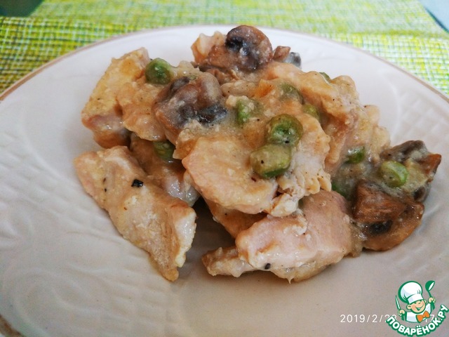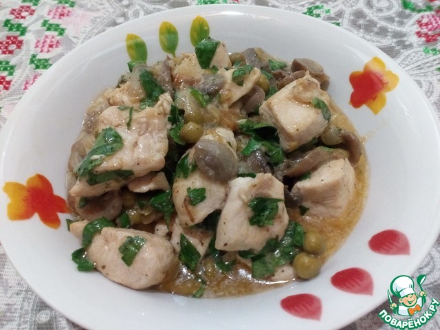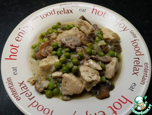 Хочу предложить вариант быстрого ужина или обеда. Куриная грудка с консервированными шампиньонами и молодым зеленым горошком готовится считанные минуты. Можно подавать с любым гарниром. Но и без гарнира блюдо замечательное. Для любителей острого, можно добавить чеснок или острый перец чили.