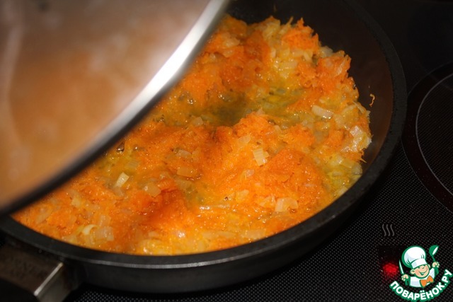 Пока курица в духовке, обжарить лук и морковь на растительном масле до мягкости овощей.