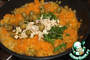 Добавить орехи, оливки, зелень и прогрейть под крышкой еще 5 минут.