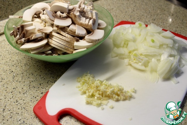 Грибы нарезать тонкими пластиками, лук - четвертинками колец, чеснок - мелко.