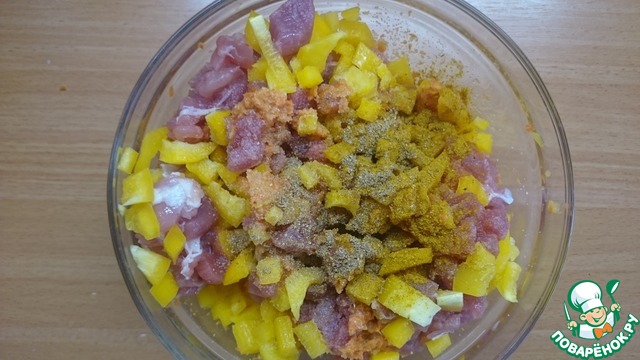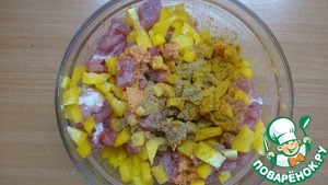 Добавляем болгарский перец, мясо и специи. Перемешиваем.