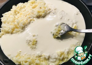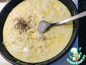 Вылить сливки, хорошо перемешать, попробовать на соль и перец, если надо добавить. Выложить рис.