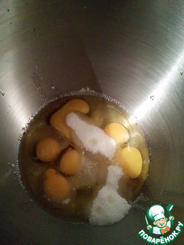 В чашу вбиваем охлажденные яйца ( у меня яйца небольшие, поэтому я беру 6 шт), сахар и ещё 0.5 ч. л. сока лимона. -