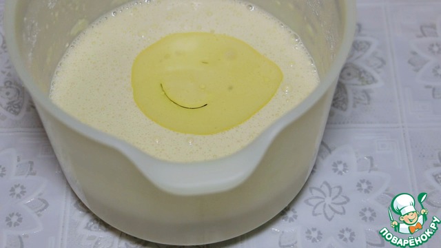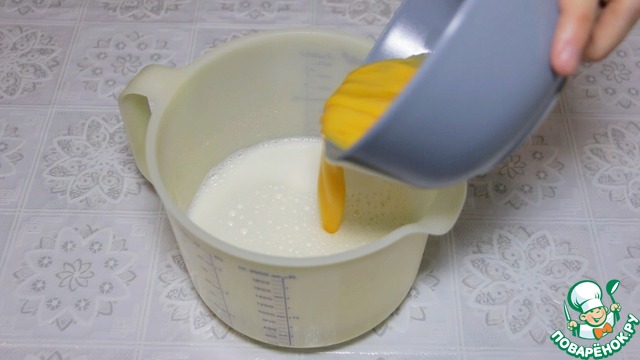 2) Взбалтываем яйца и выливаем в тёплое молоко.