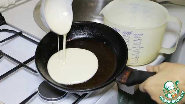 5) Черпаем тесто половником и круговым движением распределяем его по сковороде, чтобы блинчики получились круглыми. Печём блинчики до золотистой корочки.