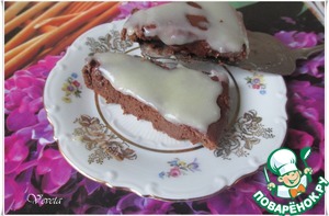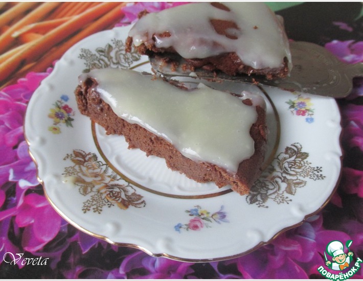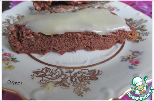 Остужаем корж в форме, вынимаем. Можно просто присыпать сверху сахарной пудрой, можно полить любимой глазурью. Я растопила половину белой шоколадки с 2 ст. ложками сливок и полила теплый коржик сверху.