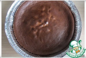 Дно формы диаметром 20 см застилаем пергаментом и обильно смазываем растительным маслом. Выливаем смесь в форму и ставим в духовку. Выпекаем около 30 минут. Сначала корж сильно вырастет, а потом немного опадет. Выпекаем до зарумянивания поверхности коржа.