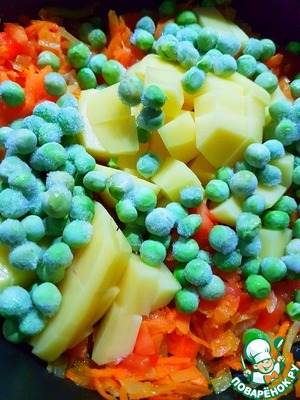 Добавить картофель, нарезанный небольшими кубиками и горошек. Посолить. Залить 1л. кипятка. Довести до кипения и на медленном огне варить до готовности картофеля.