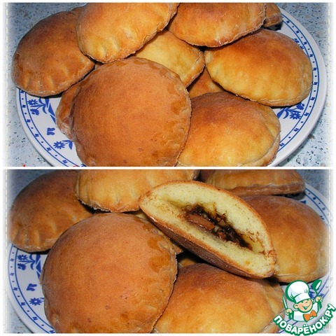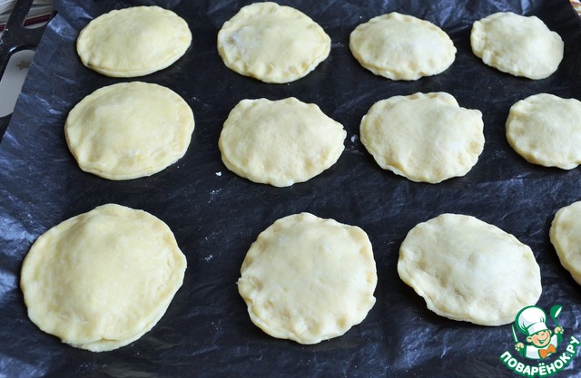На половину заготовок выложить по 1 ч. л. начинки, накрыть вторым кружком, защепить. -