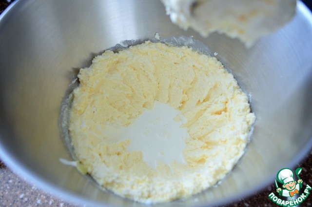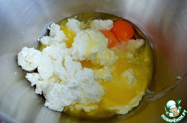 Творог, яйцо и желток, оба вида масла смешать до однородности. -
