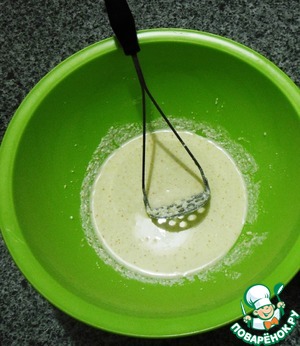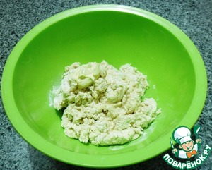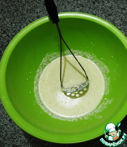 Убедившись, что дрожжи активные, (о чем говорит появление пузырьков, а затем пенки), смешать 1/3 смеси с творогом, размять вилкой или картофельной толкушкой до исчезновения крупных комочков.