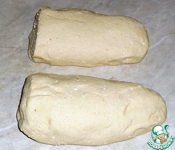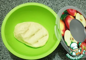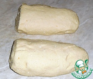 Разделить тесто на две части, одну убрать под крышку, вторую размять или раскатать в пласт 1,5 - 2 см (предварительно подпылив рабочую поверхность мукой).