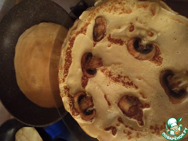 Добавить соль и черный молотый перец. Готовые блинчики нафаршировать приготовленным грибным фаршем.