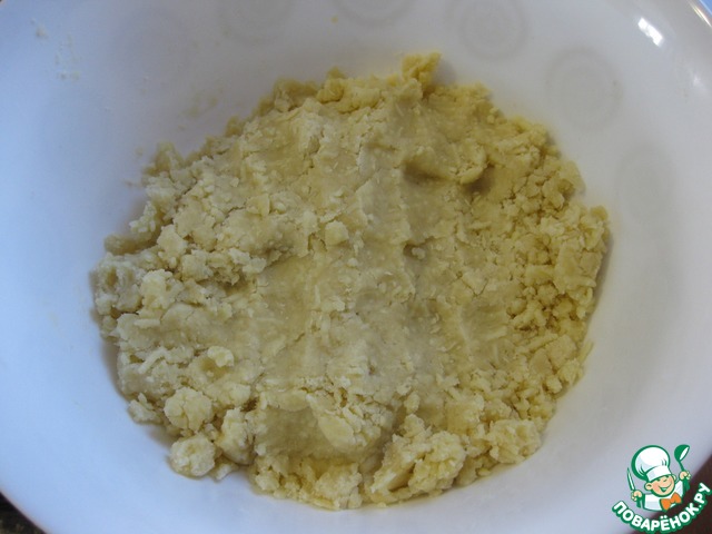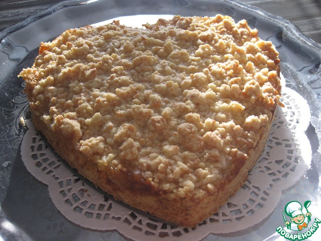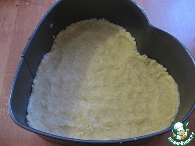 Замесить тесто, - мне пришлось делать это руками. Небольшие мои замечания по ходу процесса: по первоначальному рецепту верх пирога закрывали решеткой из теста, но этого количества продуктов едва хватило на основу для формы диаметром примерно 20 см (форма "сердечко"), и верх я просто присыпала оставшейся крошкой. Так что советую брать для теста 1,5 нормы, а если форма больше, то и двойную