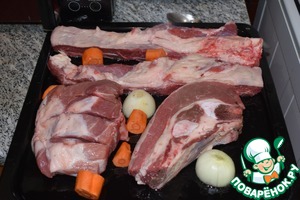 Если у Вас есть любители поглодать косточки, то сразу нужно ребрышки разобрать на порционные куски. Если косточки и хрящи будете удалять, то оставьте куски целыми. Мясо не солить, не перчить. На смазанный маслом противень выкладываем мясо, очищенные морковь и лук, разрезанные на 2 части и отправляем в духовку на 60 минут на 180 гр. В последние 5 минут включить верхний гриль.