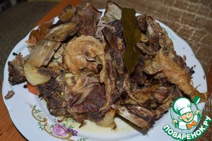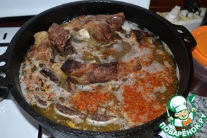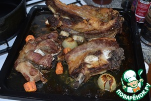 Достаем полную красоту. Перекладываем мясо в казан или другую толстостенную посуду, сливаем тщательно весь мясной сок с противня. По противню пройтись лопаткой и все в кастрюлю. Выложить все составляющие для бульона, залить пивом и бульоном. Ориентир. Мясо должно быть еле прикрыто жидкостью. Поставить на максимальный огонь. Закипело. Огонь убавить на самый минимум и оставить под крышкой. Если у Вас свинина, то на 40-60 минут, если говядина и баранина - на 90-120 минут. У меня стояло 2 часа. За 1 час до готовности добавить лук и морковь с противня в кастрюлю.