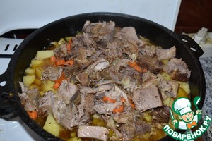 Если Вам нужно мясо без костей, достаем мясо и разбираем. Если мясо нужно с косточками, то просто добавляем к нему картофель. Температуру под бульоном выставляем максимальную и отправляем в него картошку. Как закипело, огонь на минимум и под крышку на 30 минут. Я морковку и лук из бульона мелко режу и добавляю с мясом в кастрюлю, они такие пропитанные, но можно и выбросить.