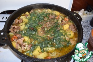 Разобранное мясо выкладываем сверху на картошку и продолжаем тушить под крышкой. Через полчаса добавляем обжаренный до прозрачности на растительном масле репчатый лук, нарезанный полукольцами и замоченный хлеб. Хлеб перед этим перемешать ложкой. Содержимое казана перемешать и отправить под крышку еще на 20-30 минут. За 5 минут до готовности добавить тмин и мелко нарезанный укроп. Если готовим с бараниной то хорошо бы добавить 1 чайную ложку зиры. Я в это блюдо приправ много не добавляю, оно очень самодостаточное и насыщенное. Мне больше нравится это качество подчеркнуть, а Вы можете добавлять специи на свое усмотрение.