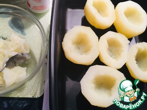 С другой стороны картофеля вырезать серединку или чайной ложкой в другую посуду вынуть картофель. -
