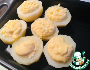 Заполнить картофель начинкой, сверху присыпать оставшимся сыром.