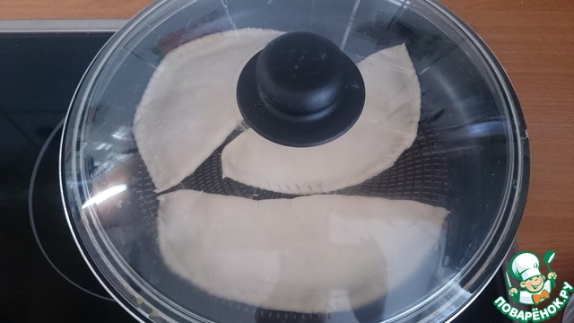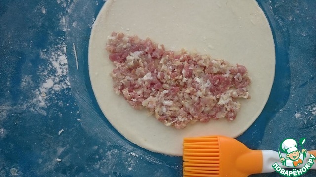 Я делаю с большим количеством начинки и чтобы тесто и мясо не остались сырыми, готовлю так: выкладываю на хорошо разогретую сковородку и обжариваю на среднем огне одну сторону под крышкой, вторую без крышки. -