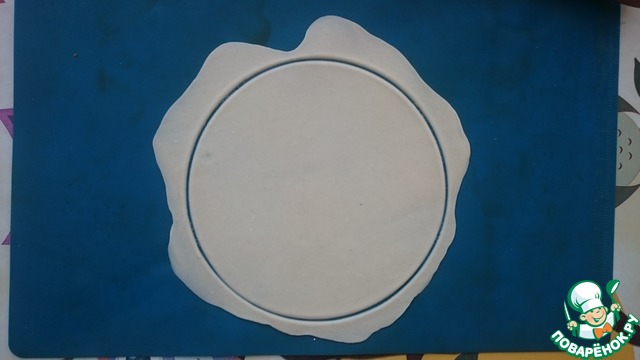 Рабочую поверхность и скалку обильно посыпаем мукой. Раскатываем тесто в пласт толщиной 1-2 мм. Вырезаем круг. Мне нравится использовать крышку от кастрюли, очень удобно надавливать и держаться за ручку.