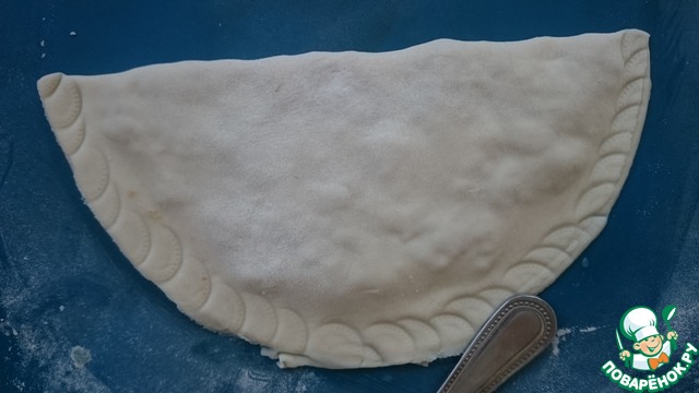 Накрываем начинку второй половиной заготовки, выдавливаем лишний воздух и склеиваем края. У меня со склеиванием вечная проблема, поэтому делаю это обратной стороной ложки.