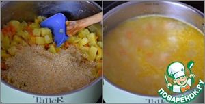 Промытую кукурузную крупу всыпать в кастрюлю с овощами, перемешать и прогреть овощи вместе с крупой 3-4 минуты. Затем залить содержимое кастрюли горячей водой или бульоном. (мясным или овощным) Густоту супа регулируйте по вашему вкусу и желанию.