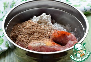 В фарш (говядина/курица) добавить мускатный орех, паприку, чесночный порошок, отруби (пшеничные или кукурузные), крахмал и соль. Тщательно перемешать.