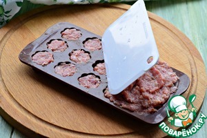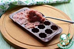Силиконовую форму для приготовления конфет заполнить фаршем при помощи кулинарной лопатки или ложки. -
