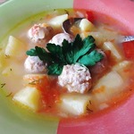 Выложить фрикадельки в кастрюлю. Как только фрикадельки всплывут на поверхность, выключить огонь, снять кастрюлю с огня, прикрыть крышкой. Попробовать блюдо на соль, посолить по вкусу. Дать настояться супу минут пятнадцать.