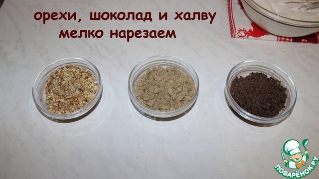 Предлагаю приготовить очень вкусный и быстрый торт без выпечки. Шоколадный корж и сметанный крем с шоколадом, орехами и халвой. Торт получается очень сочный и вкусный. Самое главное все легко и просто. Попробуйте не пожалеете.