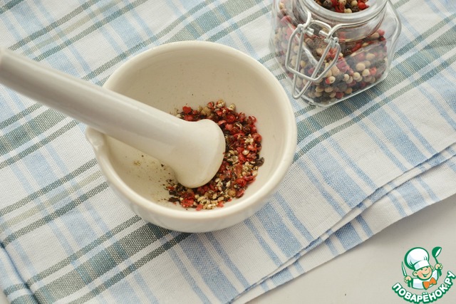 Смесь перцев горошком раздробите пестиком в ступке, но не в порошок, а чтобы были крупные фракции.