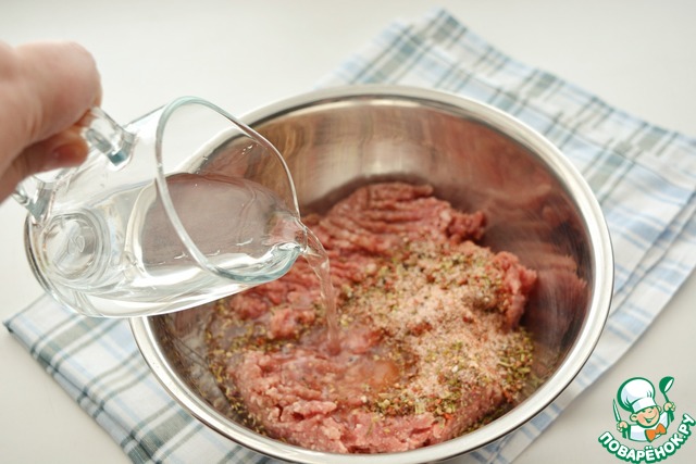 Добавьте к фаршу смесь всех специй, соли и сахара (из шага 2), влейте ледяную воду