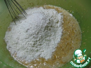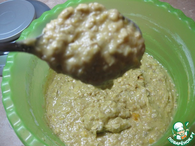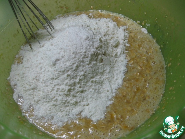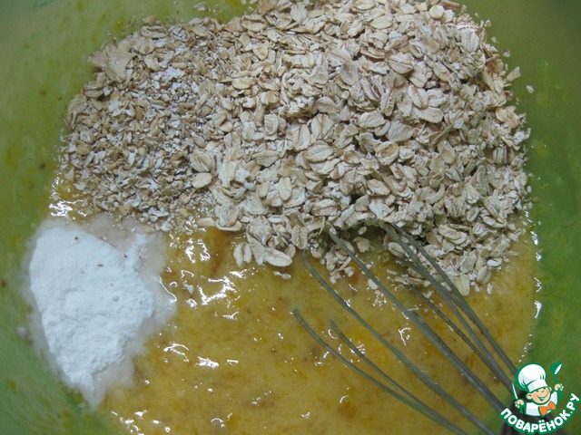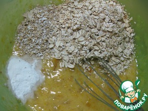 Добавить разрыхлитель, овсяные хлопья и отруби, размешать