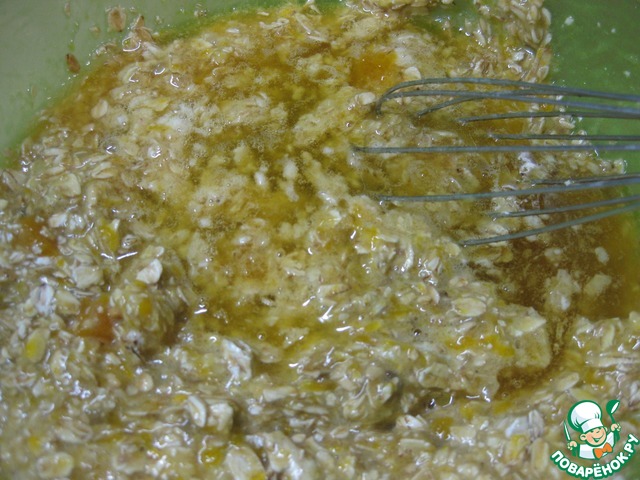 Влить остывшую до теплого смесь масла и меда, перемешать и дать постоять минут 20-30, чтобы хлопья немного стали мягче