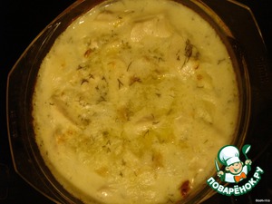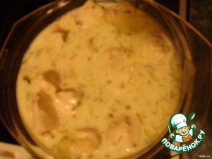 • И в огнеупорную посуду выкладываем курочку и заливаем соусом так, чтобы курочка немножко выглядывала (на фото видно)!