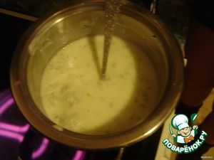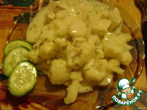 • Тем временем делаем сметанный соус: прокаливаем муку, добавляем сливочное масло и обжариваем вместе до золотистого цвета, затем вливаем стакан бульона (я брала отвар от цветной капусты, но можно развести кубик любого вкуса), все быстро перемешиваем, чтобы не было комочков, а затем добавляем стакан сметаны средней жирности, но НЕ жидкой! даем прокипеть минут 5 и добавляем специи и зелень!