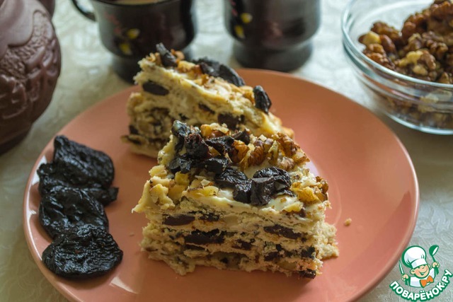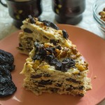 Орехи с черносливом под сметанным кремом создадут изысканный десерт который никого не оставит равнодушным. Со всей подготовкой приготовление торта без выпечки займет около 20 минут. Если вы любите поджаренные орехи, то есть такой торт можно сразу. Если же, как мне, нравятся мягкие орехи - дайте торту немного пропитаться.