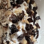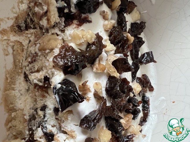 Чернослив заранее промойте горячей водой и слегка обсушите. Нарежьте его мелко как показано в видео и выложите сверху орехов.