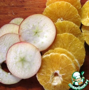 Апельсин очистить от кожуры, нарезать тонкими кружочками. Также нарезать яблоко.